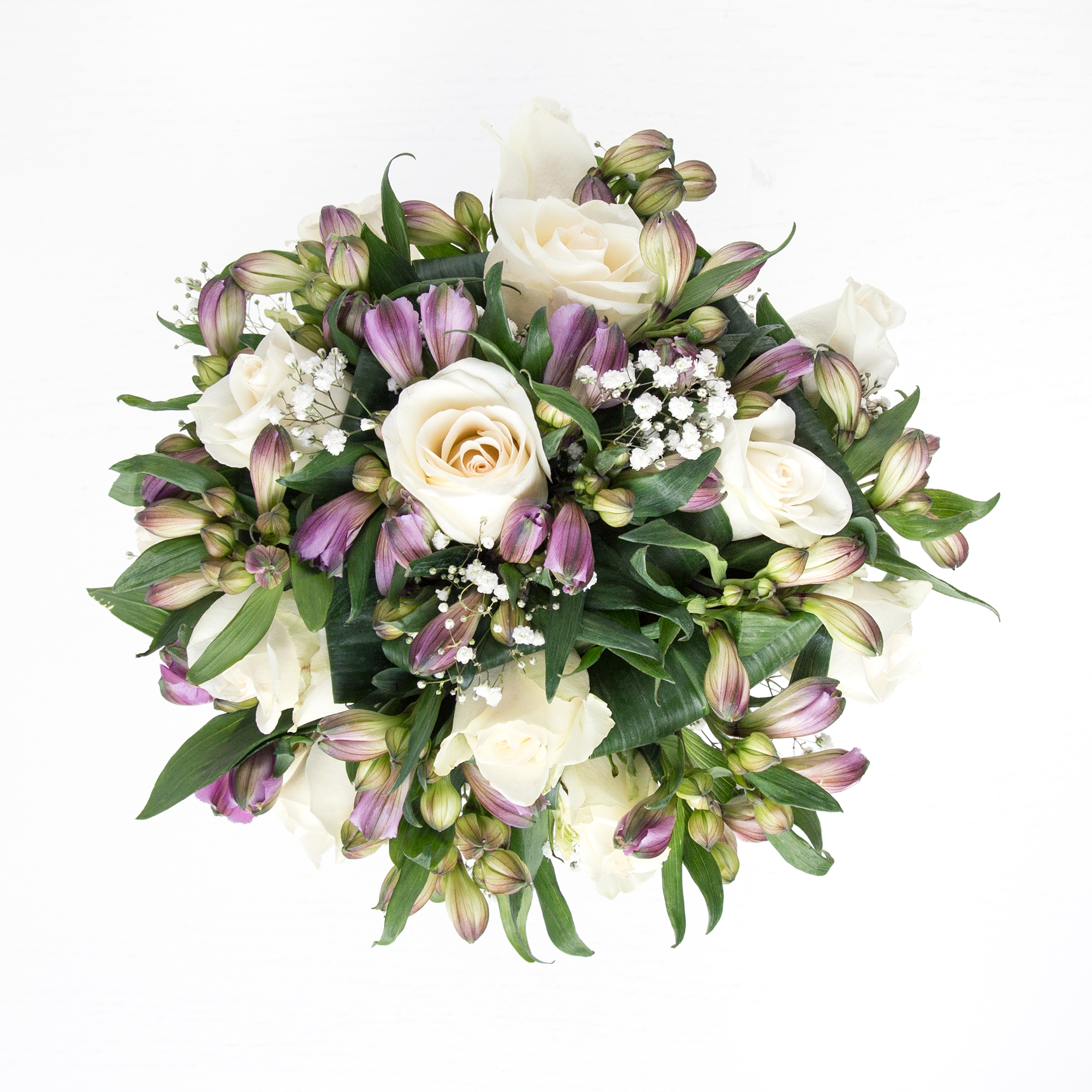 Purity and simplicity is the best description for this hand-tied. Cream ivory roses and royal purple alstroemeria, accompanied with white gypsophila and aspidistra leaves will express your deep honour and sorrow.